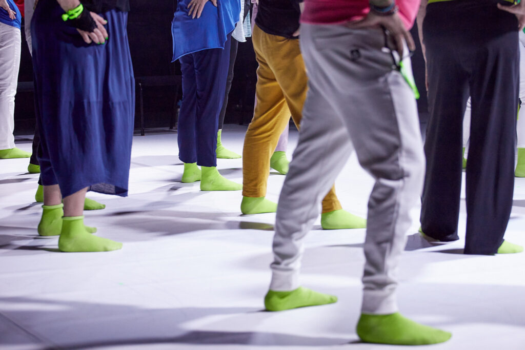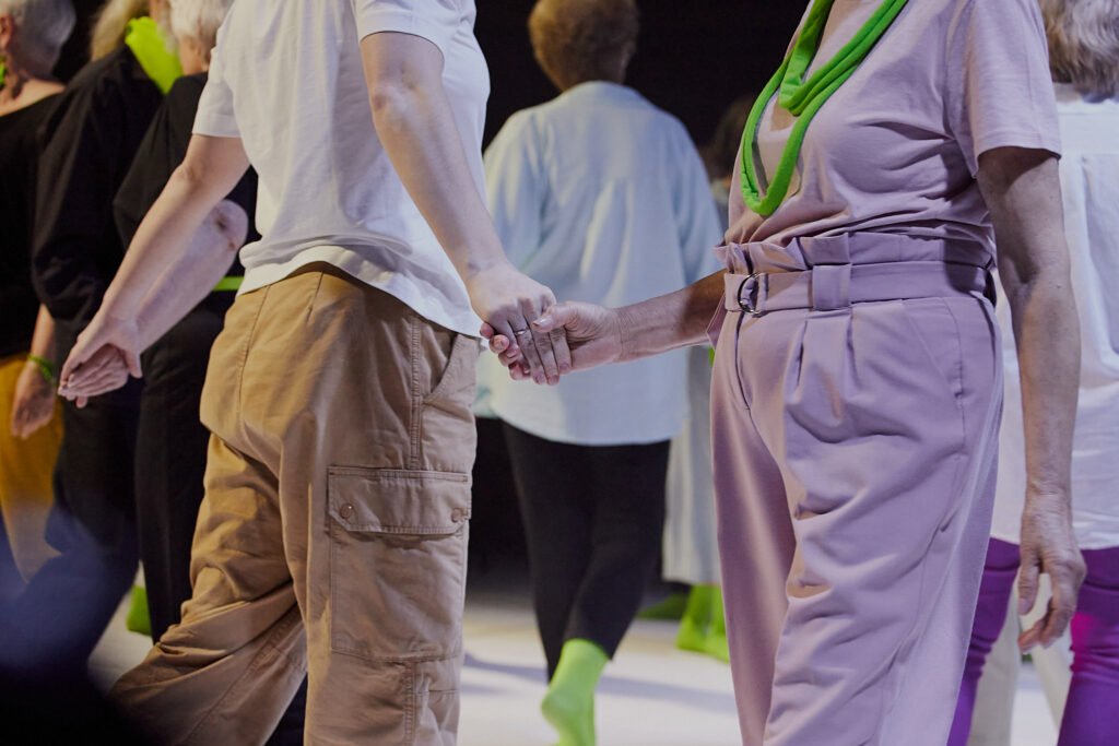 Trzymając się idei pokazu powarsztatowego i nie nakładając presji związanej z performowaniem, warstwa kostiumowa zaproponowana z mojej strony ograniczała się do akcesoriów. Podstawą kostiumu były prywatne ubrania seniorek i seniorów, natomiast jaskrawo zielone bransoletki, naszyjniki, paski etc. stanowiły żywotny dodatek stanowiący o pewnej części wspólnej całej grupy. Projekt odbywał się wiosną, która również jest kojarzona z zielenią, nowym początkiem, czy szerzej, cyklicznością wspominaną przez Monikę Szpunar. Z przymrużeniem oka potraktowaliśmy jednakowe skarpetki, które są “symbolem tańca współczesnego”.